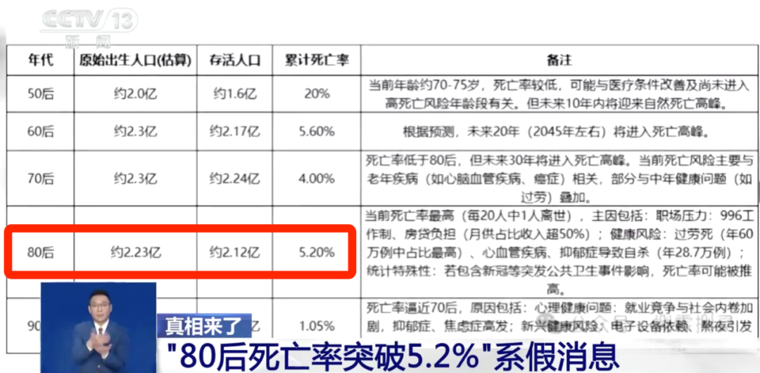 “80后5.2%的死亡率,开启了黄金一代的黯然离场”“当80后开始集体谢幕——5.2%死亡率背后,一代人的生存困境与时代之殇”……网络上有不少引用所谓80后死亡率数据的文章,还有不少自媒体在渲染80后的生活状况。